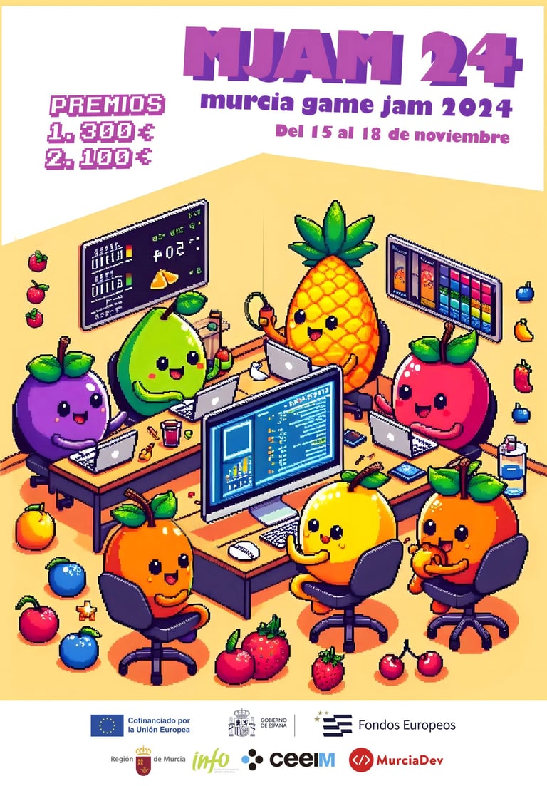 La MJAM 2024 es una game jam organizada por la comunidad MurciaDev, centrada en reunir a desarrolladores, artistas y entusiastas del videojuego de la Región de Murcia. Se trata de un evento de carácter informal y cercano, pensado para fomentar la creatividad y el aprendizaje en un ambiente colaborativo.